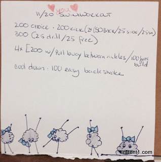 Each time I reach the wall, I look at my handy workout scrap of paper to see what’s next. This is what I saw today. Hannah had embellished. I smiled each time.