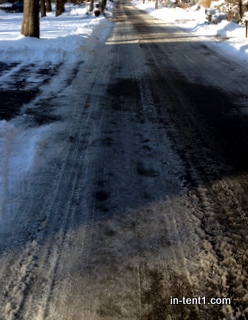 The roads were not great. I fit in 7 miles into just over an hour & 5 minutes of running and completely disregarded the “surges”. About a mile of the route would have been safer with Yaktrax, but there were 3+ miles where pavement was exposed, so I felt OK having left them behind. The wind was freezing on my exposed face, but my core was warm enough. I had waited until lunchtime to run – in order for the sun to be at its highest and strongest. This would provide the day’s maximum ice melting for the roads. On a crisp fall day, I can cross paths with many runners at lunchtime. Yesterday I crossed only one – the roads and the mush were ours alone.