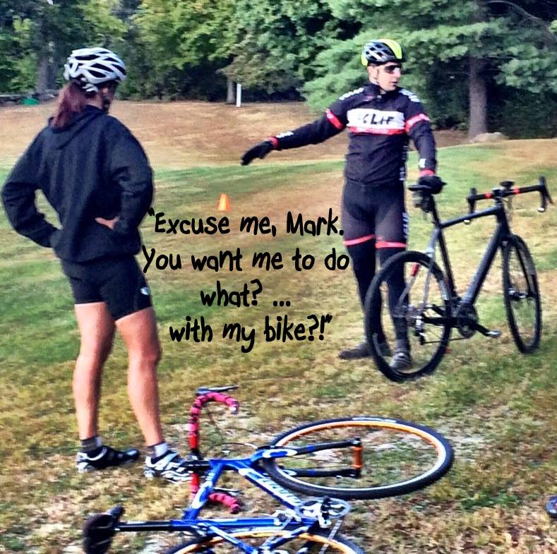 On a Friday afternoon, Jason added a saddle and wrapped the handlebars. (Perfect timing since I was signed up for a CX skills clinic, later that evening.) Weeks earlier when I signed up, I imagined having ridden the bike a few times before going to the clinic. I seriously considered bailing after trying several times to gather the courage to hurl my body on to the bike. I started to crumble into a mentally defeated pile, so I put myself into “time-out” (not joking – I sent myself to my room until I could come out with a better attitude). In the quiet, I decided that I am what I am – an otherwise competent human, with no cyclocross skills or experience.
