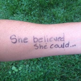 The fuel belt was so irritating that I didn’t notice any bike to run fatigue. (yay?) Eventually, I got the belt to stay closed, adjusted as well as possible, and just accepted it as an imperfect part of life. I put my attention to great running posture and upbeat cadence – and I felt solid. The hill around 1 ½ took more out of me than I hoped and posture / cadence / pace recovery felt slow. I started getting grumpy and my brain started offering some pretty unhelpful thoughts. Happily, I didn’t get sucked in before realizing that I could probably do with some food – yay carbs / sugar! After washing down a few shotbloks with big mouthfuls of water, my happy returned. At mile 3 I knew I would finish and would still feel strong. This is when the words I had written on my arm with sharpie that morning came to my aid. “She believed she could…” I said them over and over to myself. After a while I tried a modification – “She believed she could, so she is.” I knew the hill at mile 5 was coming and my goal was to get to the base of it and then remember that the hill is tough, feeling tired while running up it ≠ ‘I suck’. When I got to the top I created another modification – “I believe I am!”